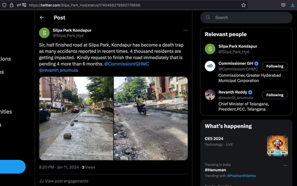 Today, we had a visit from a reporter from Eenadu News who documented the ongoing issues with the incomplete construction of Maharshi Marg road. These pictures will likely be featured in the newspaper either tomorrow or the day after.